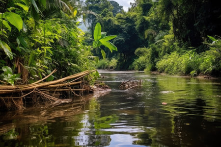 jungle river with fishing equipment next to exotic plants, created with generative ai