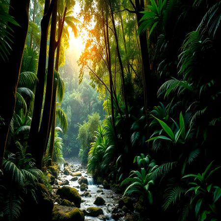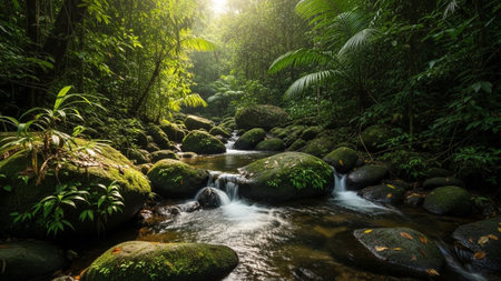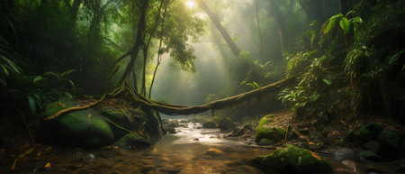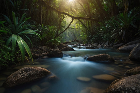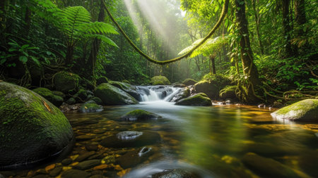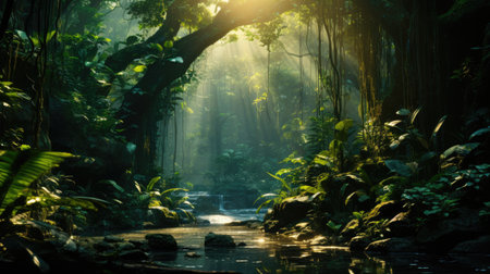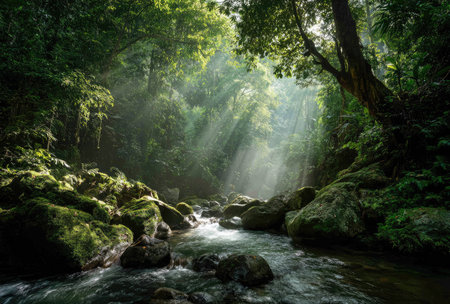 Sunbeams shining through canopy of trees in tropical rainforest illuminating a pristine stream