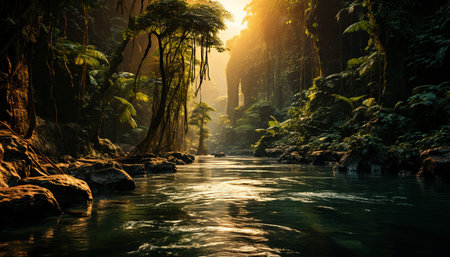 Lush green forest, tropical rainforest, tranquil scene, flowing water, wilderness generated by artificial intelligence