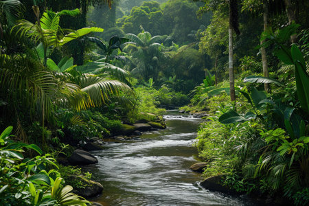 Discover vibrant Costa Rican rainforest with lush greenery and tranquil waterways. Concept Rainforest Exploration, Costa Rican Wildlife, Lush Greenery, Tranquil Waterways, Nature Photography