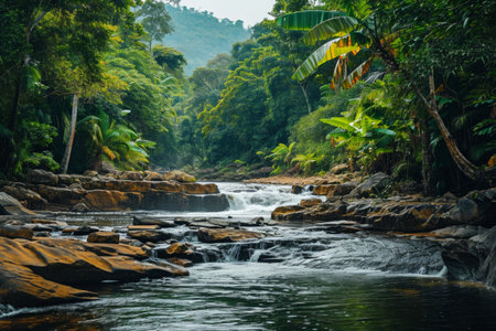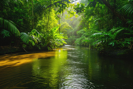 Tropical rainforest with river flowing through lush green forest with AI-Generated Images