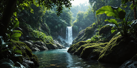 Hidden rain forest waterfall with lush foliage and mossy rocks, amazing nature