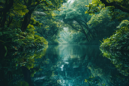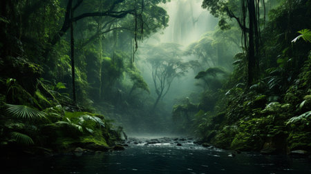 A calm river flows through a vibrant rainforest, surrounded by dense foliage and mist. The peaceful setting creates a sense of tranquility and natural beauty.