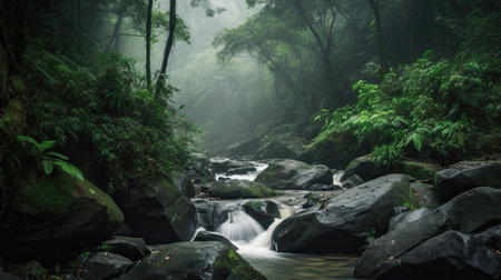 Foggy forest with a flowing stream in the jungle of Costa Rica