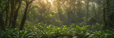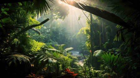 Sunbeam Piercing Through the Lush Tropical Rainforest Foliage Dense and verdant vegetation with a mystical serene atmosphere in a primeval untouched landscape