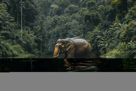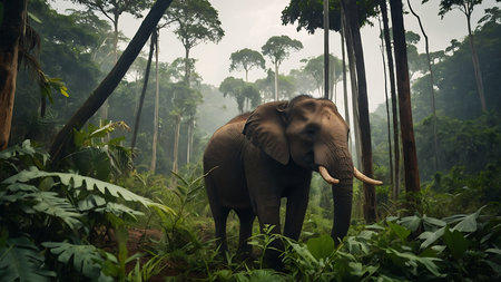 A magnificent elephant stands gracefully in the heart of a lush green forest, surrounded by vibrant foliage and a tranquil mist. This captivating wildlife scene embodies the beauty of nature.