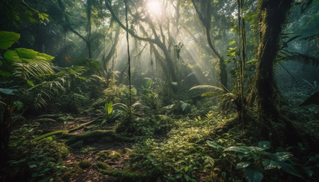 Tranquil scene of wet tropical rainforest growth generated by artificial intelligence