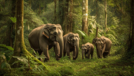 Large herd of African elephants walking through lush green forest generated by artificial intelligence