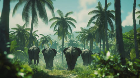 A group of elephants walking through a jungle with palm trees, AI