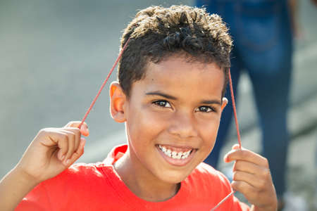 Concepcion De La Vega, DOMINICAN REPUBLIC - FEBRUARY 09, 2020: closeup portrait of young dominican boy in red t-shirt looks at camera on city street on February 9 in Concepcion De La Vega