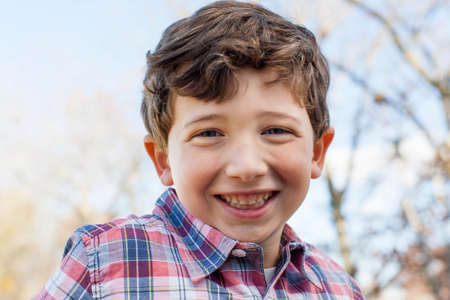Portrait of boy wearing checked shirt looking at camera smiling