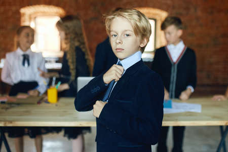smart little ceo touching his tie, looking at the camera, head of company. close up photo