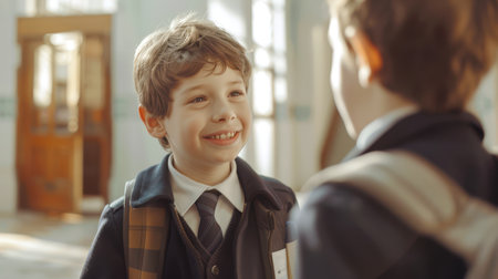 Two schoolchildren are having fun chatting outside the school building. They smile and look at each other. Back to shokla.