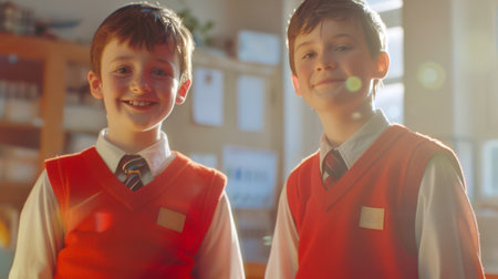 Two boys in school uniforms smile at the camera. Students in red jumpers, white shirts and ties in the school classroom. Back to school.