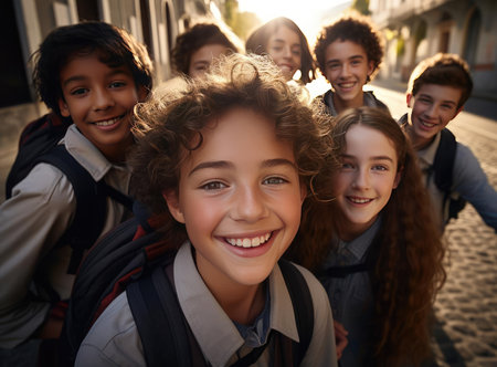 Global smiles: capturing joy in group selfies of cheerful and happy young people diverse nationalities, celebrating unity, friendship, cultural harmony in shared moments of happiness and togetherness