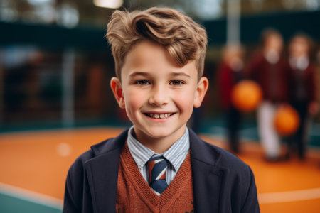 Portrait of a smiling boy in a school uniform standing on the basketball court