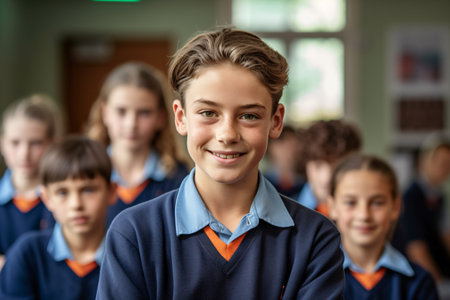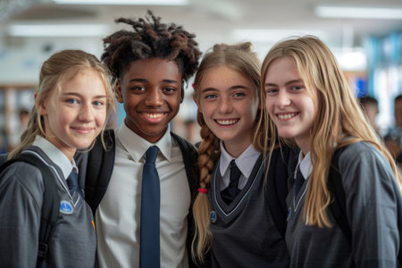 group of 4 smiling teenage students wearing uniform standing in classroom. ai generated
