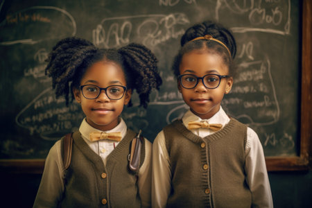 Portrait of two African American schoolgirls wearing eyeglasses in classroom