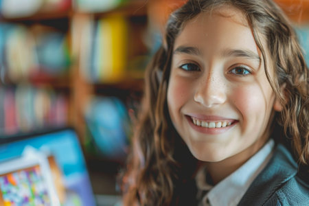 A cheerful 10-year-old Asian girl sits in a classroom, beaming with joy as she engages in an educational activity with classmates in the background during school hours, banner