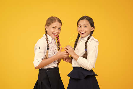 Vitamin nutrition. Fresh fruit school. Girls kids school uniform drinking orange fruit fresh juice. Schoolgirls sharing lunch. Healthy food. Vital habits. Fruits glucose energy source. School lunch
