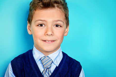 Portrait of a happy smiling seven year old boy in elegant clothes over bright blue background. Kid's fashion. Education. Copy space.