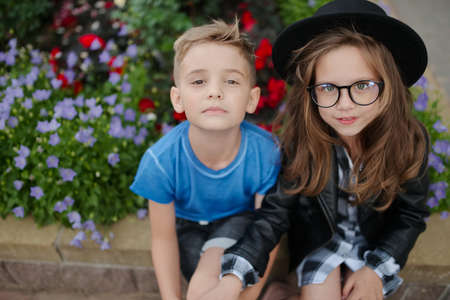 Kid's fashion. Two modern children posing together at studio. Clothes for children.