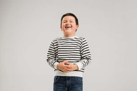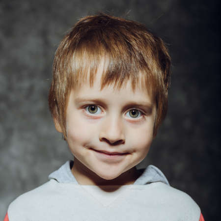 Happy six year old Caucasian boy portrait over grey background. White European kid widely smiling and looking into the camera