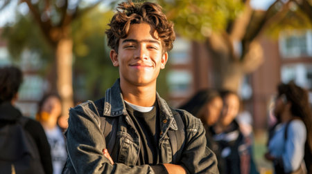 A confident young man stands with his arms crossed, sporting a friendly smile in a vibrant school setting, showcasing the joy and energy of youth.