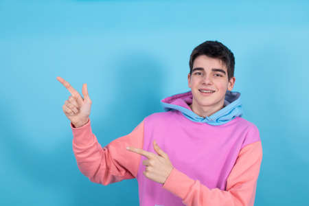 Portrait of a cute guy of European appearance with a snow-white toothy smile in a blue sweatshirt posing on a gray background