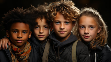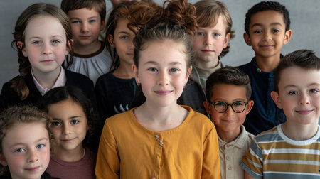 A group portrait of a teacher and her diverse class of elementary school students. - Generative AI.