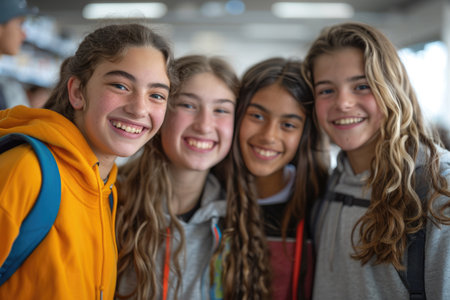 group of four happy teenage students in bright clothes standing in classroom. ai generated