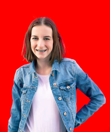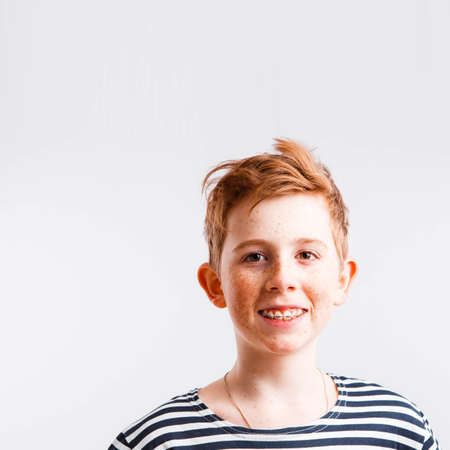 Portrait of a smiling red-haired boy with freckles and braces in a sailor suit on a white background,