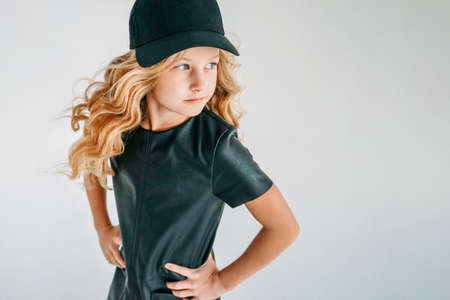 Beauty fashion portrait of smiling curly hair tween girl in black leather dress and baseball cap on the white background isolated