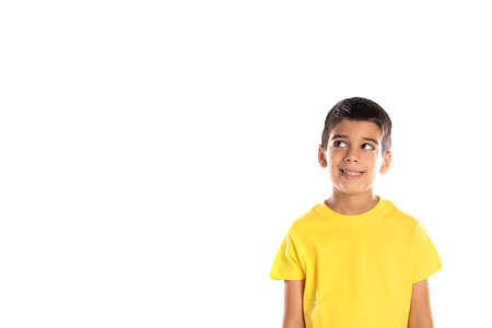 Close up portrait of a school boy of nine years old wearing light blue hoodie, looking up thoughtfully and reflectively. Child thinking with a hand on his mouth. Isolated on yellow background.