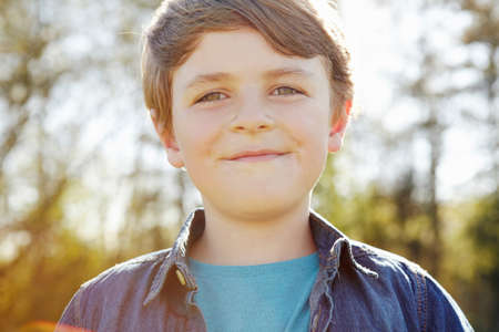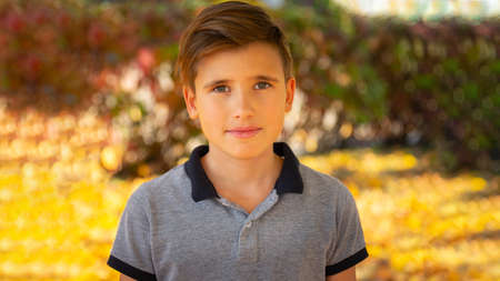 Portrait of a boy looking at the camera, autumn park on a warm sunny day. Happy childhood lifestyle concept