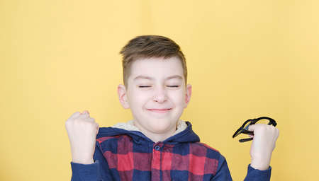 Portrait of successful teen boy winner with raised hands and clenching fists. Beautiful caucasian teenager shouting, isolated on yellow background.