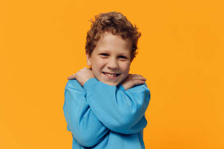 funny boy in a blue sweater stands on a yellow background with his arms crossed on his chest