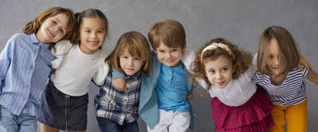 Happy friends having fun together. Banner with group of cute little kids. Team of adorable children in casual wear standing against grey studio wall, hugging, huddling, smiling and looking at camera
