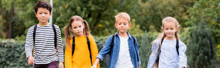 horizontal image of multicultural classmates walking along school corridor with teacher on background