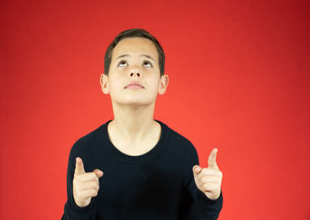 Photo of boy point index finger empty space look up wear casual style outfit isolated on red color background