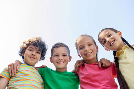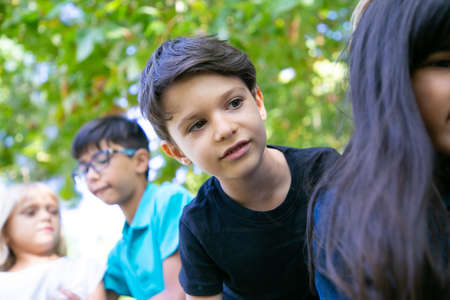 Kind. Interracial group of kids, girls and boys playing together at the park in summer day. Friendship has no race. Happiness, childhood, education, diversity concept. Look happy and sincere.