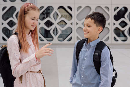Happy preteen kid boy with backpack or satchel. Schoolkid in on the way to elementary or middle school on warm sunny summer day. Healthy child outdoors on the street in the city .