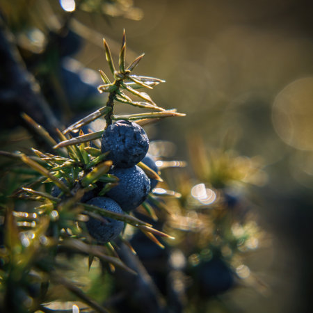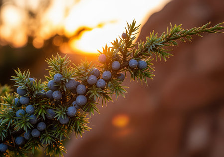 A detailed close up of a juniper branch covered in dusty blue berries and sharp green needles, dramatically backlit by the warm glow of the setting sun during golden hour.