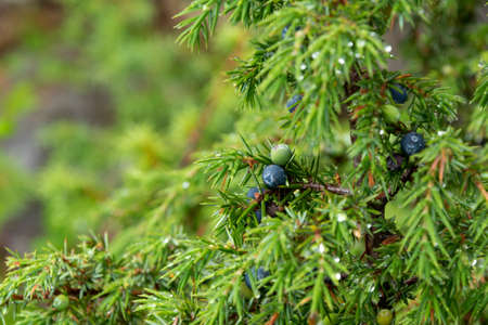 Juniper berries on a bush, natural background, selective focus