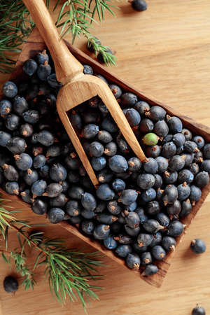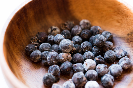 juniper berries on old wooden spoon