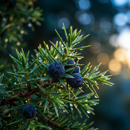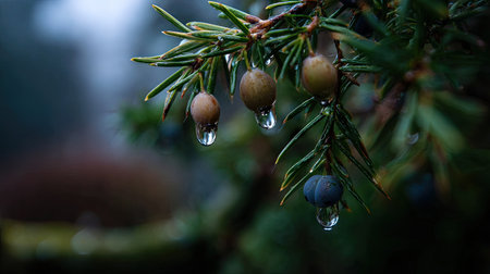 Soft rain falling gently on Juniper berry, with water droplets forming and slowly dripping. The background is softly blurred with a natural, moody atmosphere.