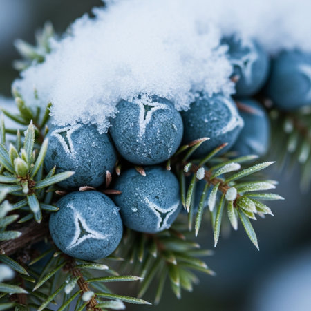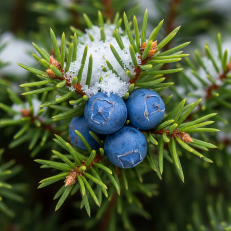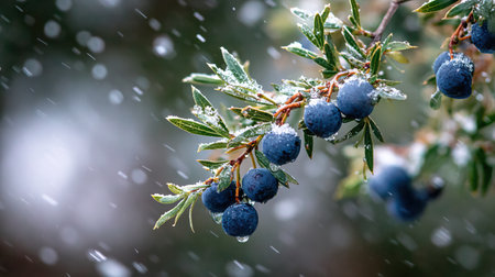 First snow falling gently on Juniper berry, a few snowflakes drifting slowly and settling on the leaves; fresh air.