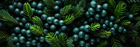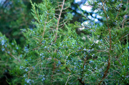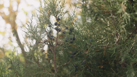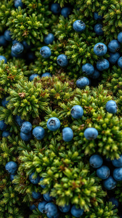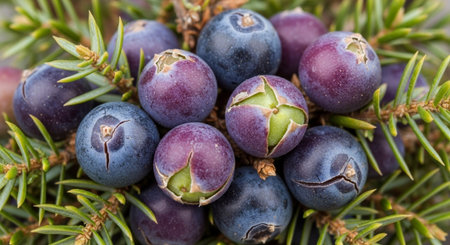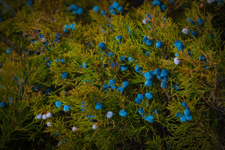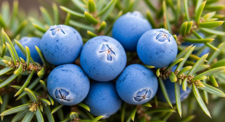 Bright juniper berries against dense green foliage, showcasing nature and wild plants