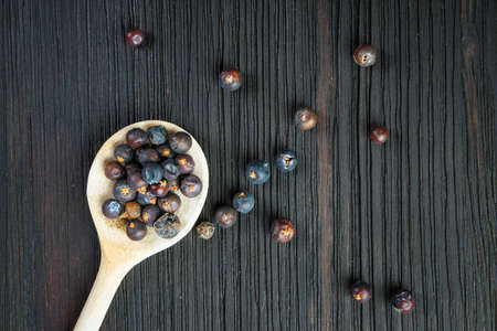 Wooden spoon with seeds of juniper on an old wooden table.