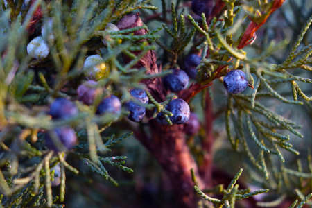 The blue berries of the coniferous tree, juniper. The cypress family. Decorative plant.